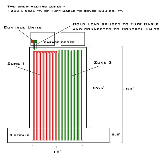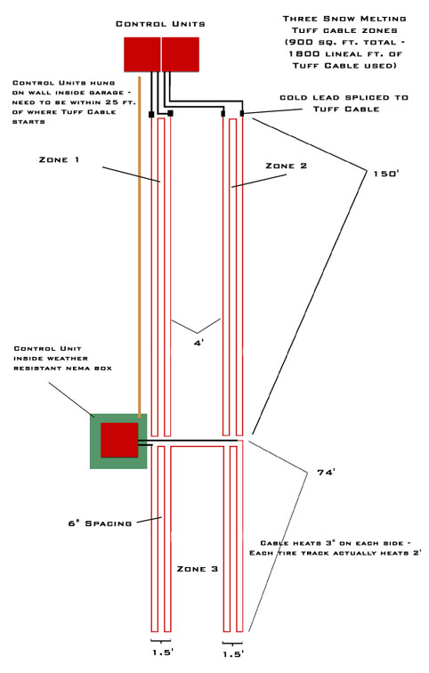 Tuff Cable Snow Melting Diagrams Tuff Cable 1 Zone Layout - Dual Tire Tracks Tuff Cable 2 Zone Layout - 18' x 33' Tuff Cable 3 Zone Layout - Tire Tracks Tuff Cable 7 Zone Layout - Tracks & Landing